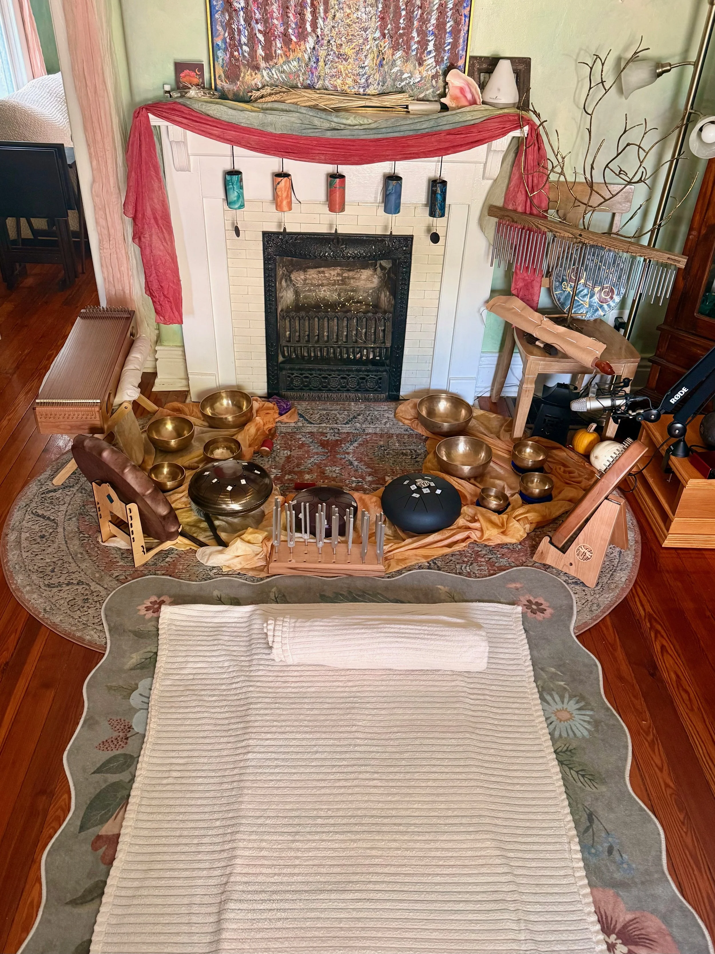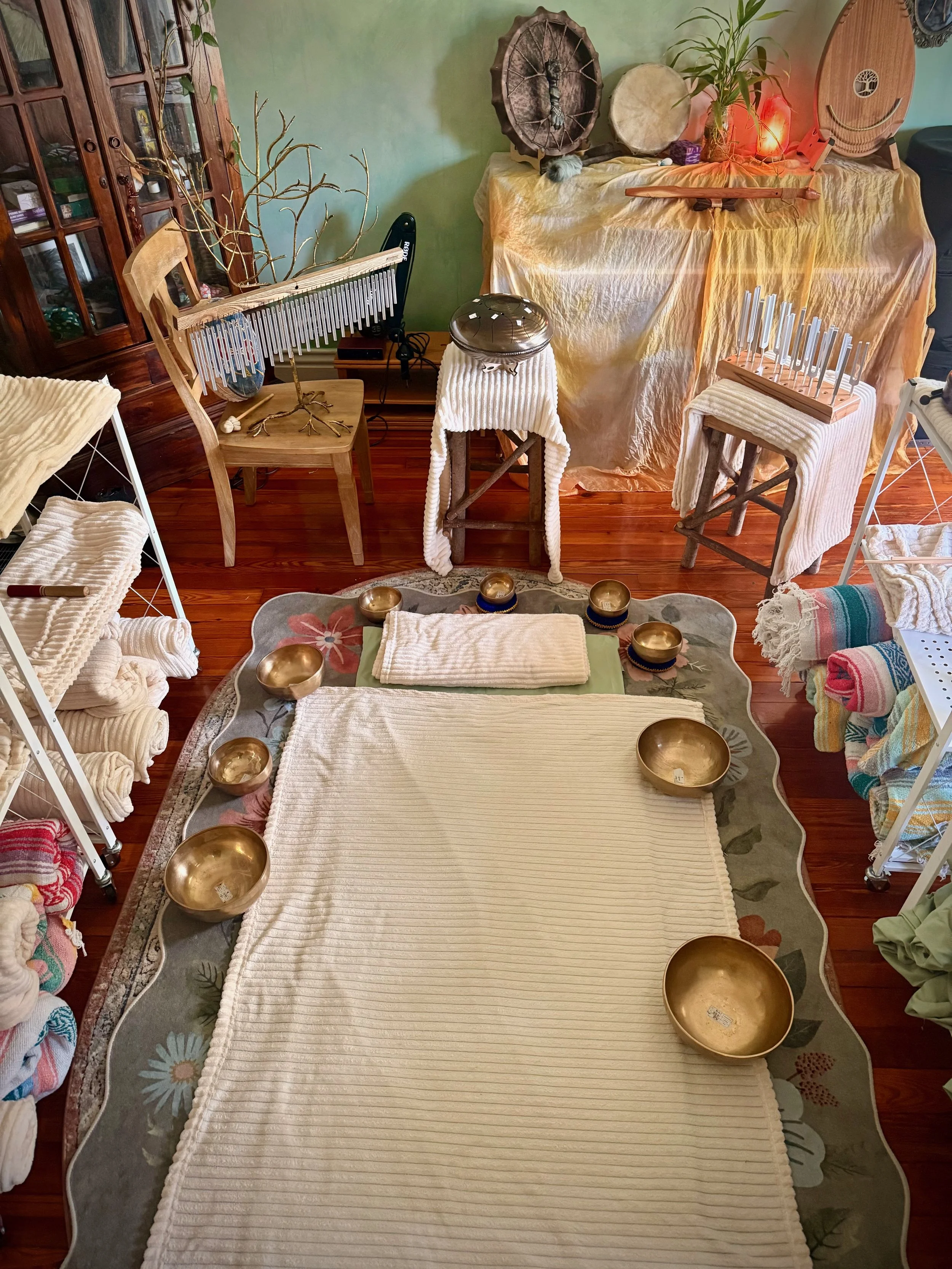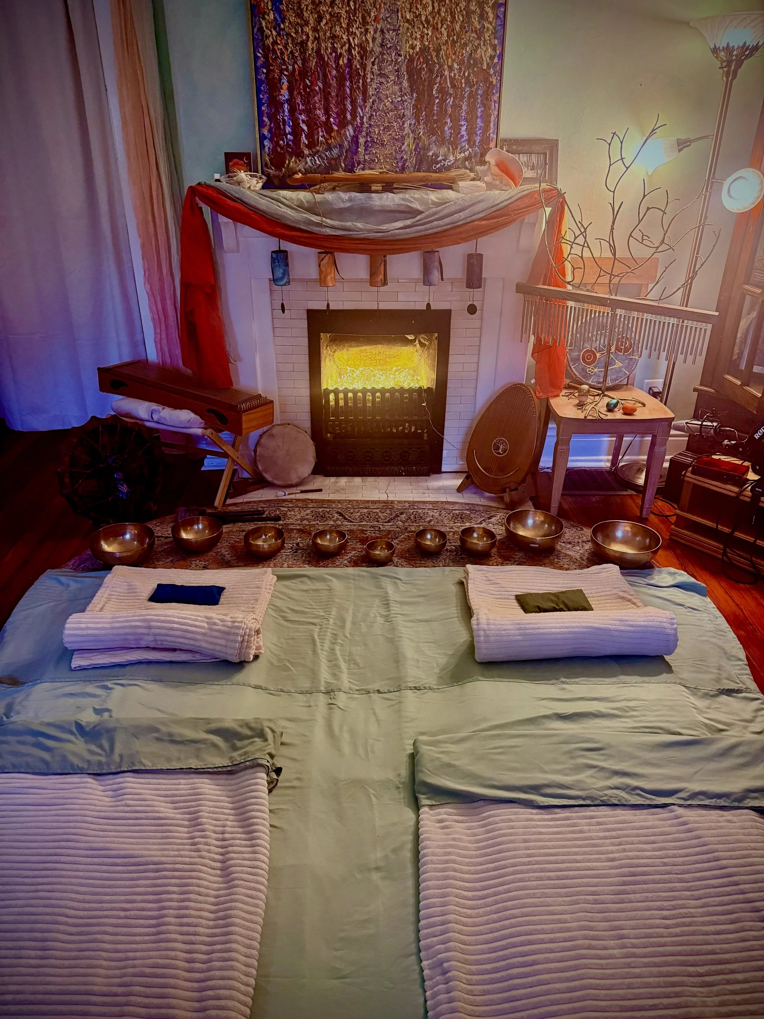 You will be lying on warmed blankets and mats on the floor. Extra blankets and supports are on hand for your comfort. If you would like a more individualized experienced, consider booking a Transformational Sound Journey.